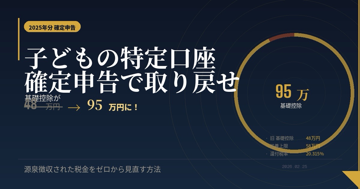 📅 2026年2月公開今年(2025年分)の確定申告から、所得税の基礎控除が従来の48万円から最大95万円に大幅引き上げ!子供の特定口座で株や投信を運用している家庭にとって、源泉徴収された税金を取り戻す絶好のチャンスです。